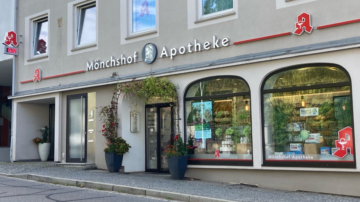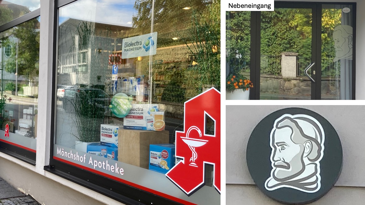 Wo Kundinnen und Kunden bereits vor Montage der neuen Werbeanlage in einer einladenden Offizin in Empfang genommen worden sind, begrüßt die Mönchshof Apotheke in Viechtach Ihre Kundschaft jetzt bereits schon vor der Eingangstür mit einer modernen und individuell gestalteten Außendarstellung inklusive Logo.